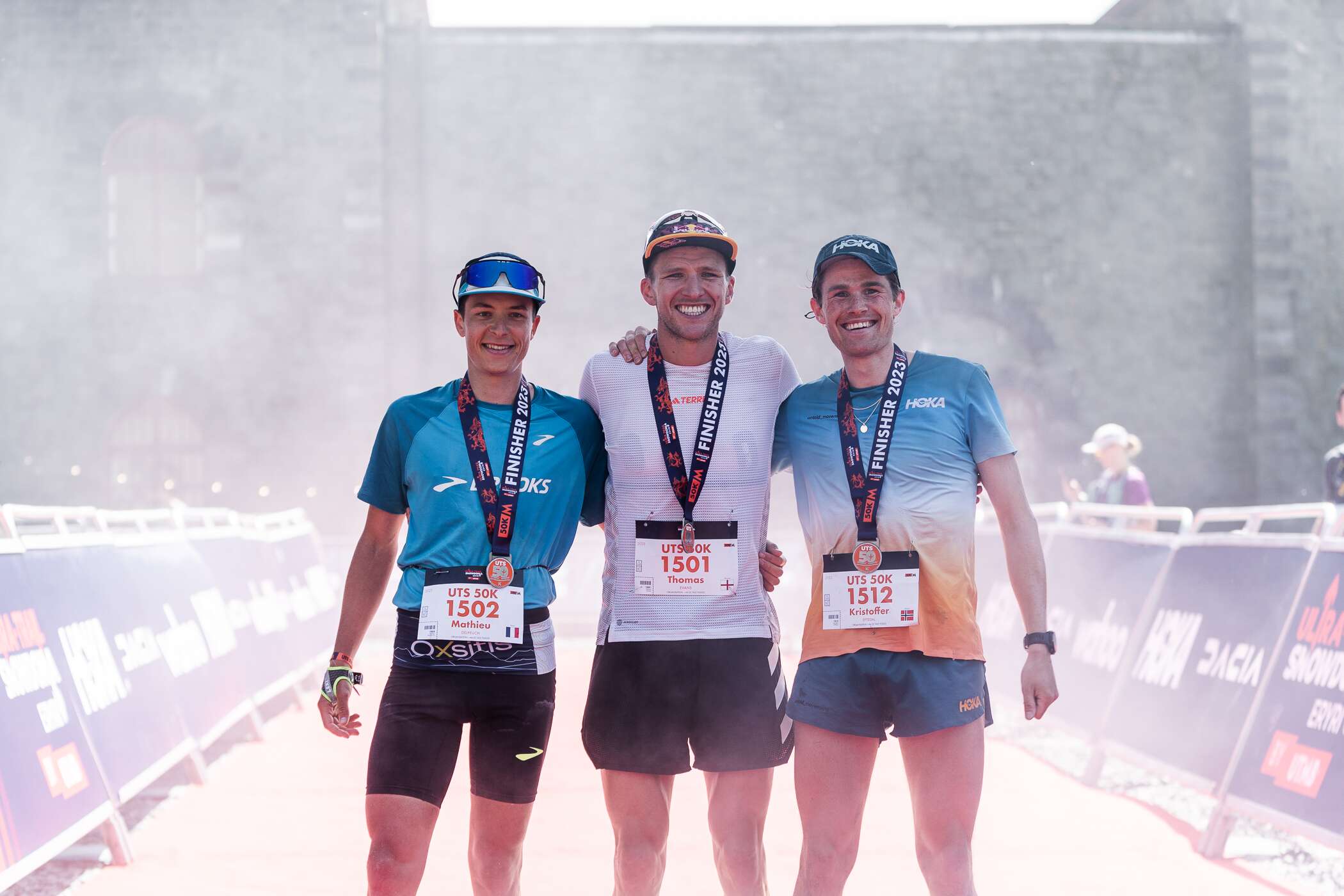 Nu är vi inte längre i den tjockaste delen av berget och vi springer över gräsbevuxna kullar och små skogar, innan vi börjar klättra det sista berget. Vi springer uppför tillsammans och jag lägger upp planen, vi ska vara tillsammans på toppen och sedan slår jag honom. Först över en topp börjar han, jag fångar honom ner. Inför nästa lite mindre topp, vad jag trodde var toppen, ligger vi tillsammans. Efter toppen går det utför innan ytterligare en liten topp, detta måste vara den sista. Det är det, och vi är axel vid axel över toppen. Nu händer det. Jag blockerar smärtan jag har haft i min fotled sedan 9 km och trycker så hårt jag kan utan att skada fotleden. Jag ser honom inte igen, jag vänder mig om då och då, men jag ser honom inte. Nedfarten går främst på en smal grusväg och vi springer tillsammans med löpare från andra distanser. Jag håller koll på klockan, kilometerna närmar sig 55 km och loppet är nästan över. Jag går över mållinjen, jublar högt och tar av hatten för en vacker dag, som slutade med en 3:e plats för mig.