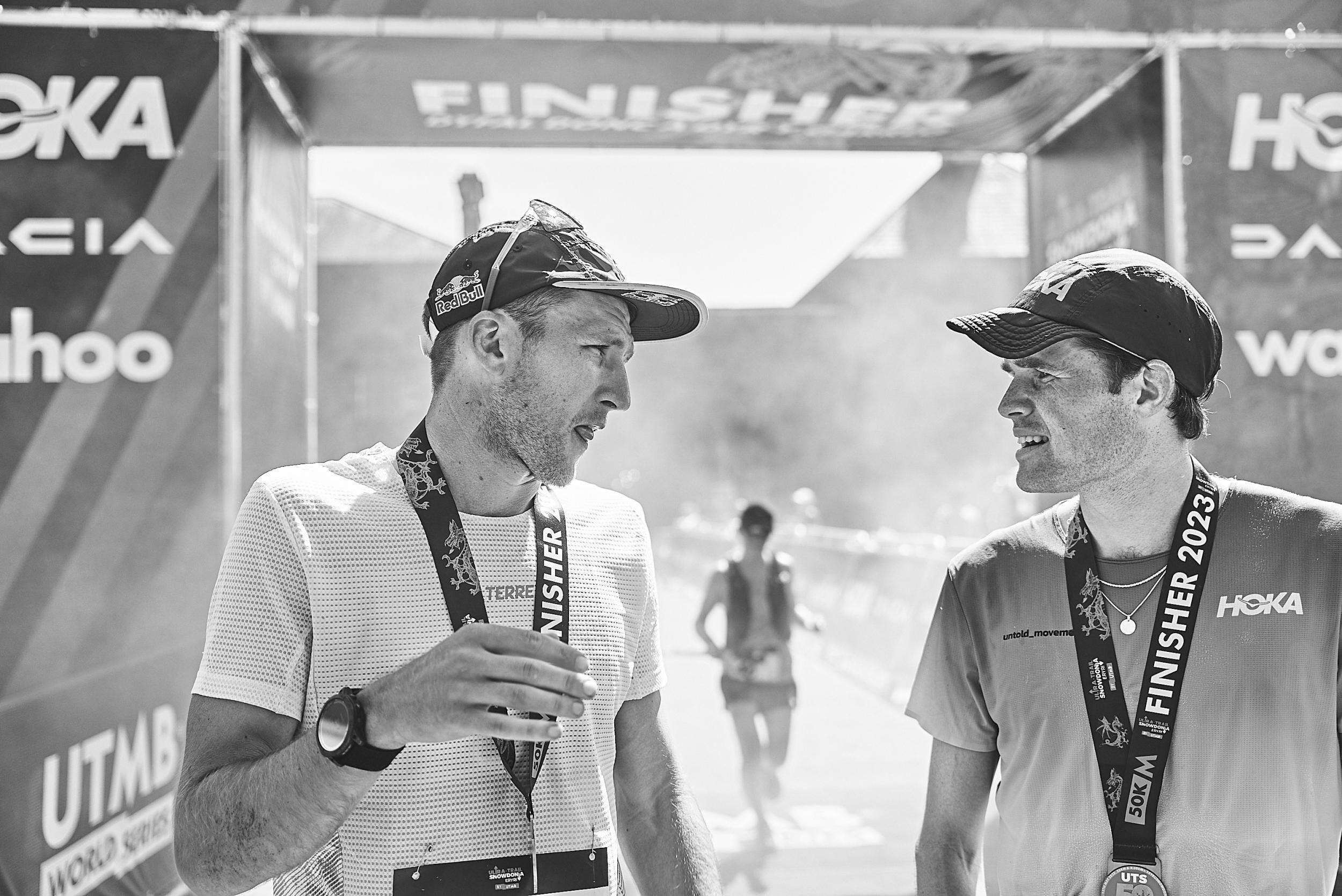 Tyvärr tar det inte lång tid innan han kommer ikapp mig igen och vi springer tillsammans en stund. Vid foten av den 3:e stora stigningen ser vi Tom på toppen av berget och en trött Stian halvvägs upp. Vi tuffar på i uppförsbacke tillsammans och kommer så småningom ikapp Stian som står utan vatten och inte mår bra. På vägen ner är jag starkare än de andra, men jag försöker att inte visa detta då jag vet att slutet av loppet är en lång nedstigning, här kommer jag att använda detta kort. Vi ligger därför tillsammans över gräsmarkerna på väg till den 3:e och sista matstationen.