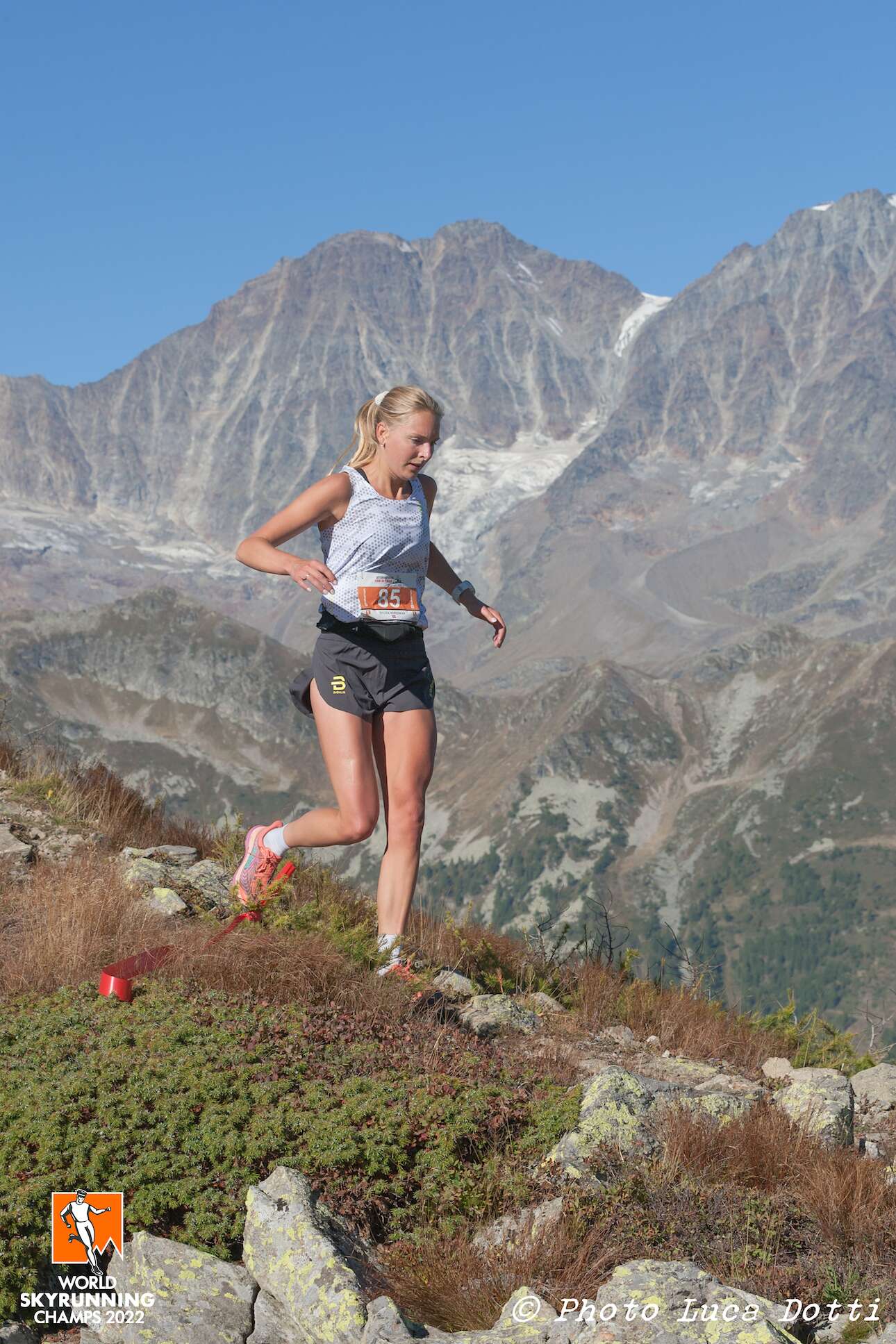 Starten gick i ett rasande tempo på en grusväg en och en halv kilometer nedför innan vi plötsligt kom in på en smal stig som tog oss rakt upp i skogen mot bergen. Jag hade bestämt mig för att starta konservativt och öka under hela loppet om kroppen kändes bra. Det var trots allt bara två veckor sedan som jag sprang CCC - 100 km genom bergen i Chamonix. Jag hängde på en bra rygg bakom italienska Martina Cumerlato upp de första hundra höjdmeterna, men fick släppa henne eftersom tempot var lite högre än jag hade planerat. Det var fortfarande över 2 000 höjdmeter kvar, och jag visste hur tufft det kunde bli mot slutet om jag öppnade för hårt. Kroppen kändes helt fin och jag njöt av de fina stigarna upp genom skogen. Plötsligt var vi ovanför trädgränsen och jag hade utsikt över dalen och in i det mäktiga bergslandskapet.