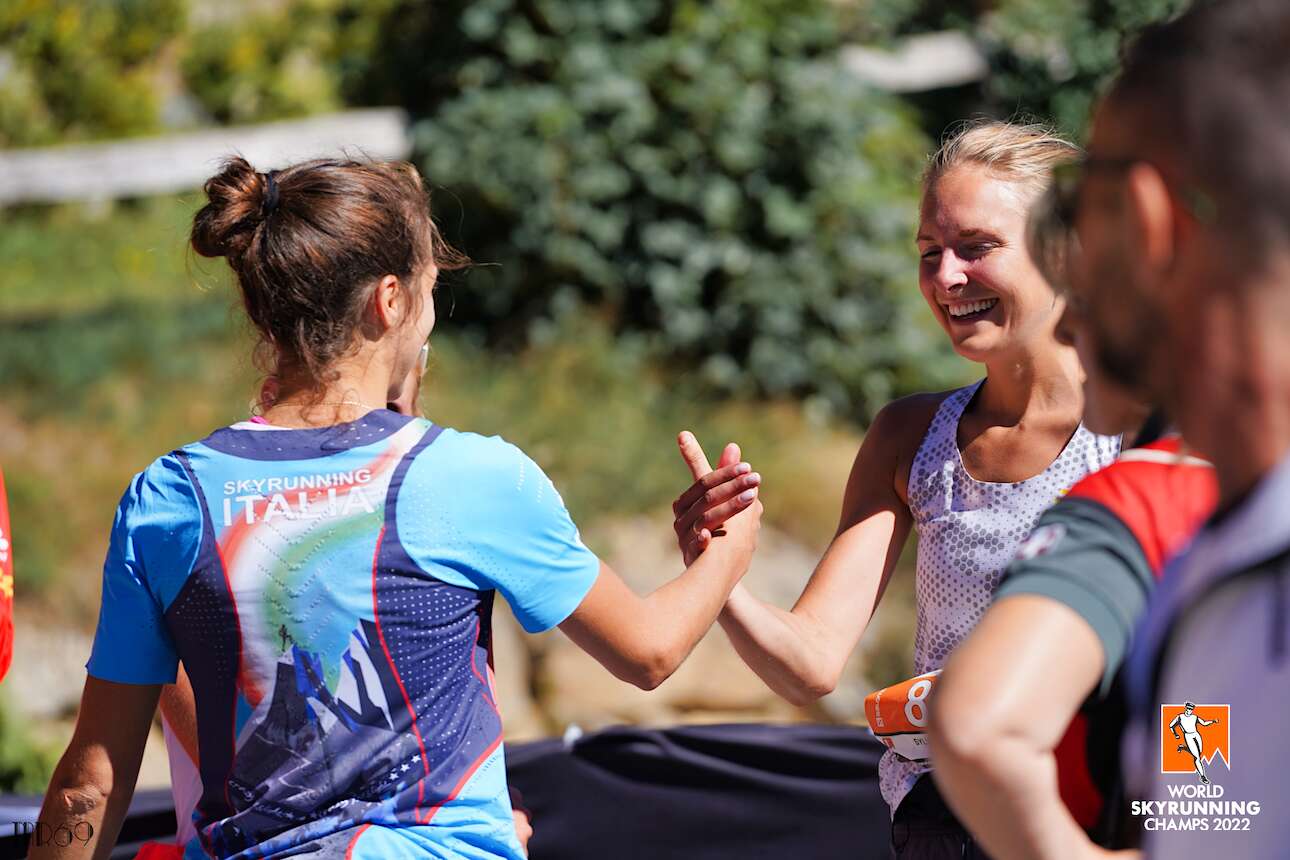 Vi var ca. 100 löpare vid starten i elitklassen så jag hade löpare runt mig hela tiden. Efter ca. Vid 13 km passerade vi den högsta punkten, Cima Verosso på 2443 m. Även om det fortfarande var tidigt på morgonen, hade massor av människor tagit vandringen till toppen, och jag var tvungen att ta mig igenom koklockor, klappningar och italienska hurrarop för att komma över det sista ägget till toppen. Därifrån böjde stigen abrupt nedåt, men jag lyckades få en skymt av de vassa bergen nära Zermatt och över nästa åsar skulle vi korsa. Helt magiskt! Över hälften av höjdmetrarna hade vunnits och jag bestämde mig för att öka farten mot nästa berg. Benen mådde bra och jag hade genomfört kostplanen med en Maurtengel per timme och vätska vid varje dricksstation. I det här loppet fanns det faktiskt 7 drinkstationer så det behövdes inte ha mycket extra i bältet. Jag spanade efter nya åsar, gärna de med långa hästsvansar, och plockade fläckar under de närmaste kilometerna. Uppför den sista stigningen fick jag jobba med huvudet, frekvensen och farten för att hålla de andra damerna jag precis passerat bakom mig. De sista fyra kilometrarna till mål gick utför och är alltid tuffa, men som tur var fick jag tag i ytterligare en löpare och lyckades hålla farten uppe. Till slut hörde jag ljudet från högtalarna och kunde runda kurvan tillbaka in på samma grusväg som vi hade börjat på. Det var en härlig känsla att springa in i målområdet med musik, hejarop och high-fiving med de andra löparna som också passerat mållinjen.